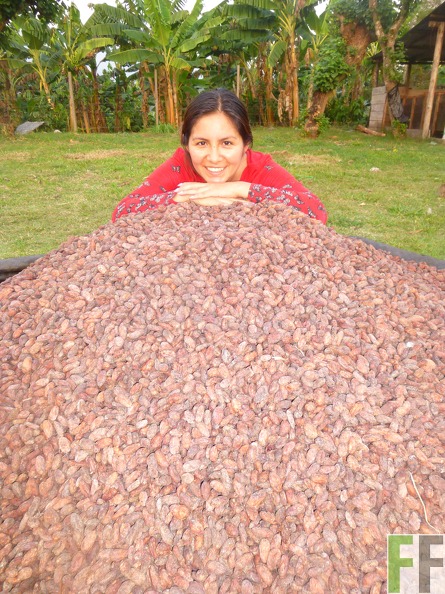 Beschreibung: Kakaoernte Sommer 2014, Marisol Najarro, Projektleiterin Peru, freut sich über die Qualität der fermentierten und getrockneten Bohnen