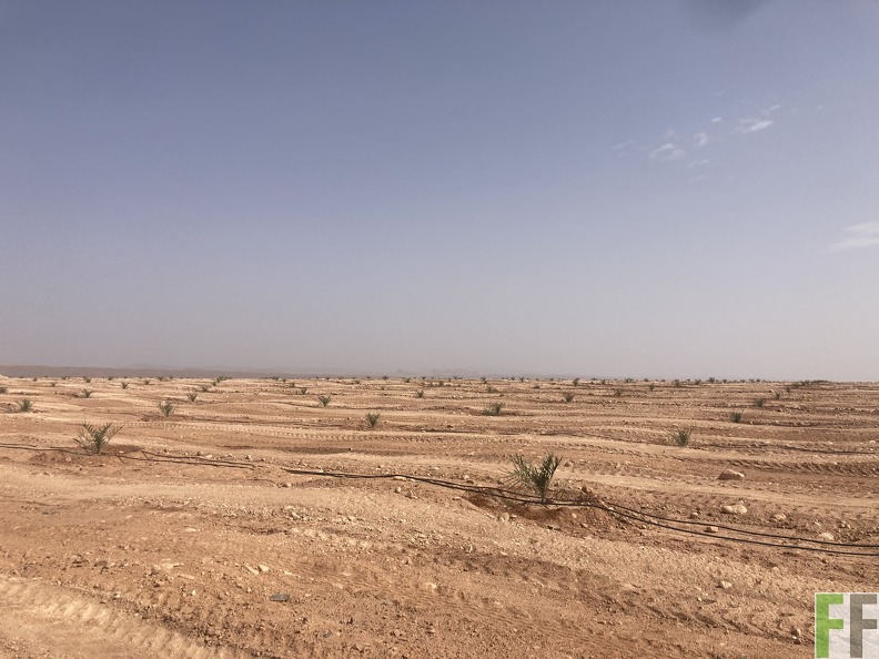 Beschreibung: Oase1-Fläche 2022. Die jungen Dattelpalmen werden über ein Tröpfchenbewässerungssystem versorgt. Im Hintergrund ist das Atlasgebirge zu sehen.